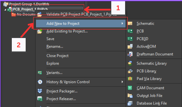 – Khi tạo xong Folder, bạn cần tạo các File (hay Document) cần thiết cho dự án như: Schematic, PCB, Schematic Library, PCB Library. Nhấp chuột phải vào Folder dự án của bạn trong Project Panel>Add New to Project>Schematic để tạo Schematic Document.