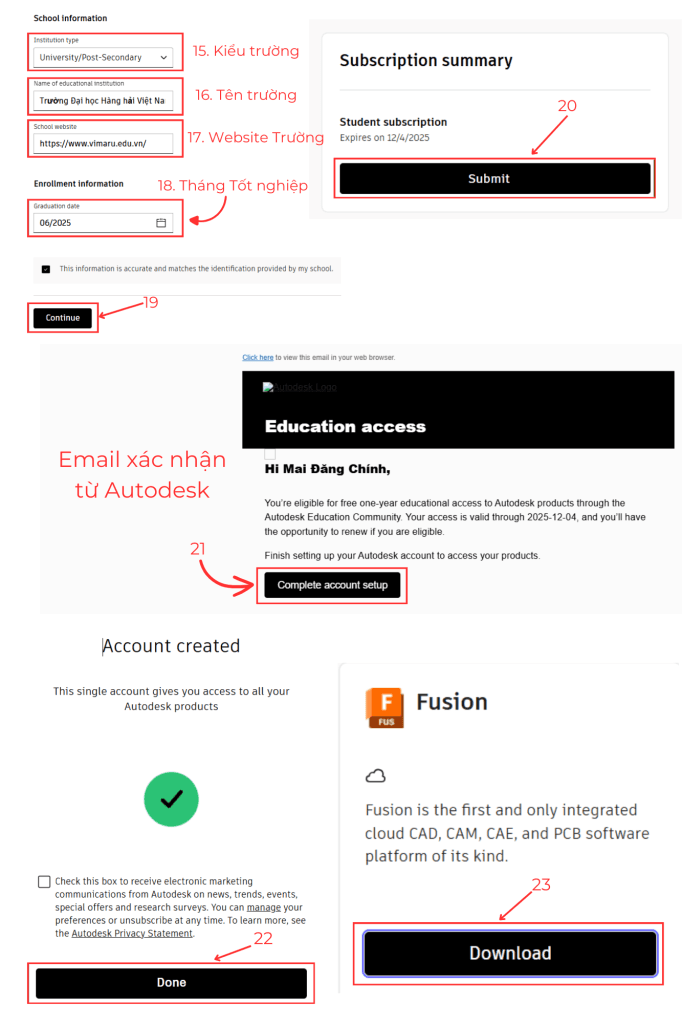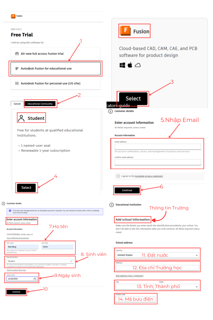 - Với sinh viên: Trang chủ của Autodesk cho phép sinh viên được sử dụng miễn phí – vừa học, vừa nâng tầm bản thân mà không lo đau ví. Tại Việt Nam, rất nhiều trường Đại học, Trung tâm Đào tạo và công đồng kỹ thuật đã đưa Fusion vào trong chương trình giảng dạy, tạo điều kiện cho người học tiếp cận với công cụ hàng đầu này.