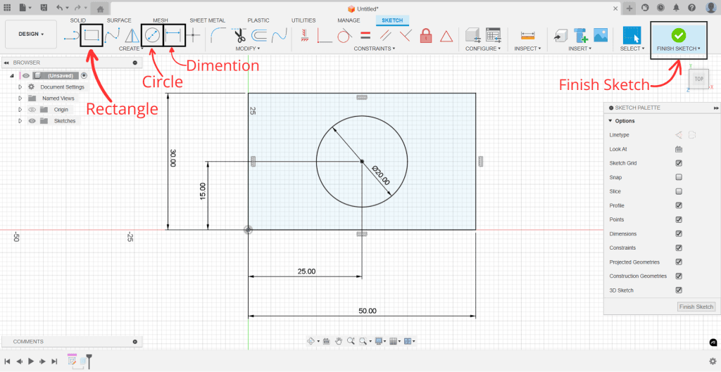 Chúng ta sẽ bắt đầu phác thảo 1 bản vẽ đơn giản với lệnh Create Sketch. Vẽ hình chữ nhật, hình tròn bằng các lệnh Rectangle, Circle. Sau đó, thiết lập kích thước như trong ảnh bằng lệnh Dimension. Cuối cùng, ta nhấn “Finish Sketch” để hoàn thành Sketch.