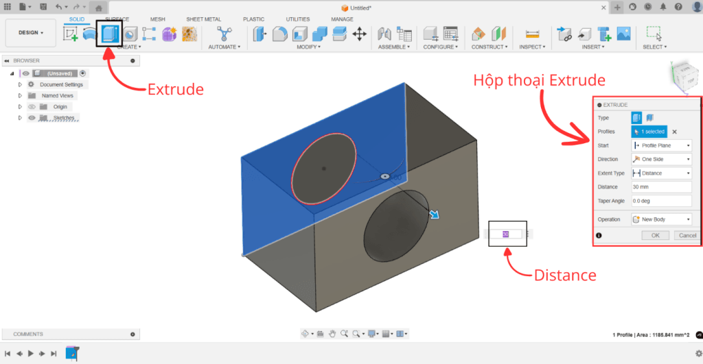Để tạo hình khối 3D, ta dùng lệnh Extrude trên thanh công cụ, nhập Distance là 30 mm. Nhấn chọn OK trong Hộp thoại Extrude hoặc Enter trên bàn phím để hoàn thành lệnh.