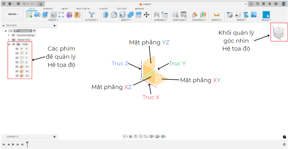 Fusion 360 sử dụng Hệ tọa độ Đề các (Cartesian Coordinate System) để định vị và quản lý các đối tượng trong không gian 3D. Hệ tọa độ gồm ba trục X, Y, Z giao nhau tại gốc tọa độ (0, 0, 0), là cơ sở để xác định chính xác vị trí và hướng của các đối tượng trong dự án. Trong Fusion 360, Gốc tọa độ (0,0,0) là điểm duy nhất cố định và hệ tọa độ được minh họa như hình sau: