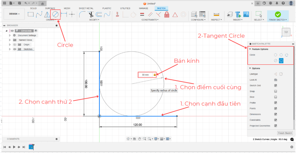 Hình 11: Lệnh vẽ hình tròn với bán kính và tiếp xúc 2 cạnh