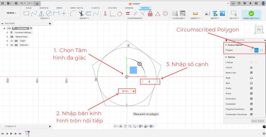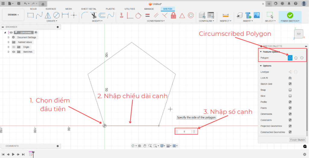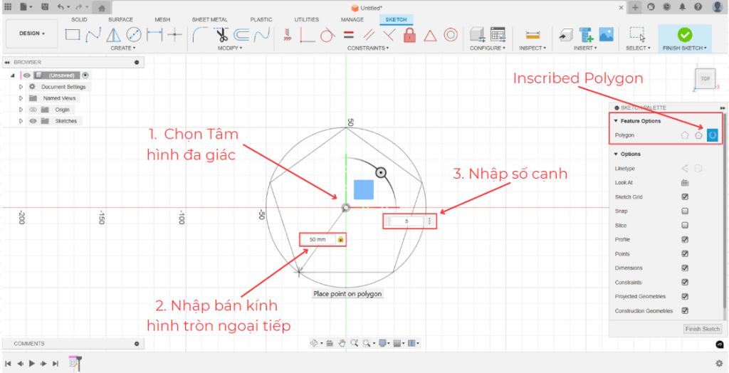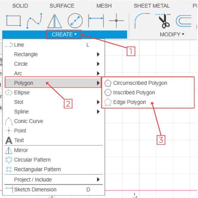 Trong Fusion 360, các nhà phát triển phần mềm đã tích hợp lệnh Polygon giúp chúng ta vẽ bất kì hình đa giác đều nào. Bạn sẽ tìm thấy lệnh Polygon bằng cách mở rộng thanh công cụ Create, và ở đây có 3 công cụ khác nhau để vẽ hình đa giác đều.
