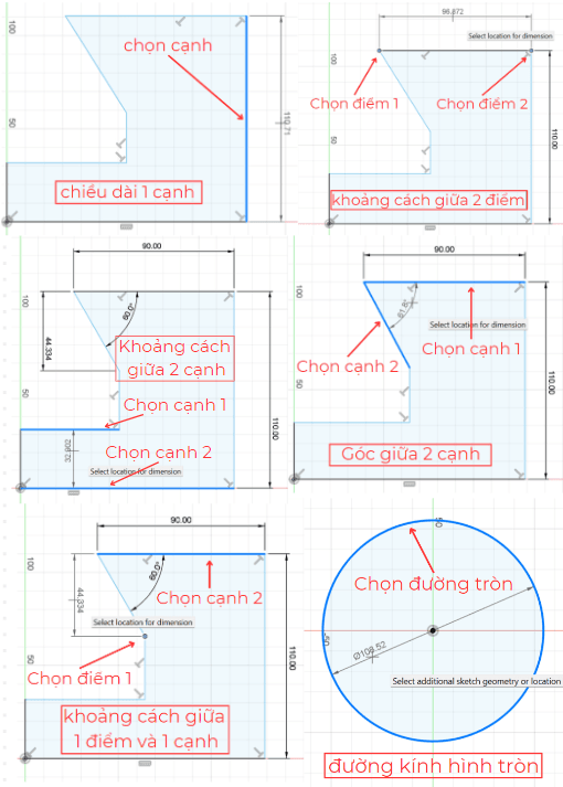 Lệnh Dimension là một lệnh quan trọng trong việc thiết kế, nó giúp ta cố định bản vẽ bằng kích thước thực tế. Để một bản vẽ 2D hoàn thiện thì ta phải thêm đầy đủ kích thước cần thiết. Trong Fusion 360, phần mềm sẽ tự động chuyển đổi giữa các loại ghi kích thước, vì vậy bạn chỉ cần lựa chọn đối tượng cần thêm kích thước. Sau khi lựa chọn xong các đối tượng, nhấp con trỏ trái chuột để nhập kích thước từ bàn phím.