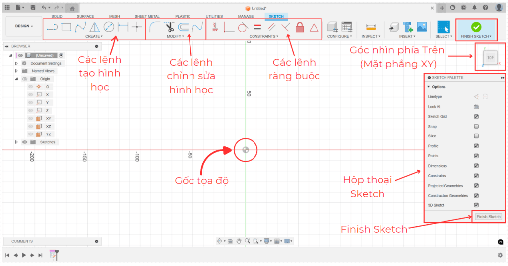 Để vào môi trường 2D, ta sẽ sử dụng công cụ tạo bản phác thảo (Create Sketch) trên thanh công cụ và chọn 1 mặt phẳng bất kỳ. Giao diện của môi trường 2D sẽ như sau: