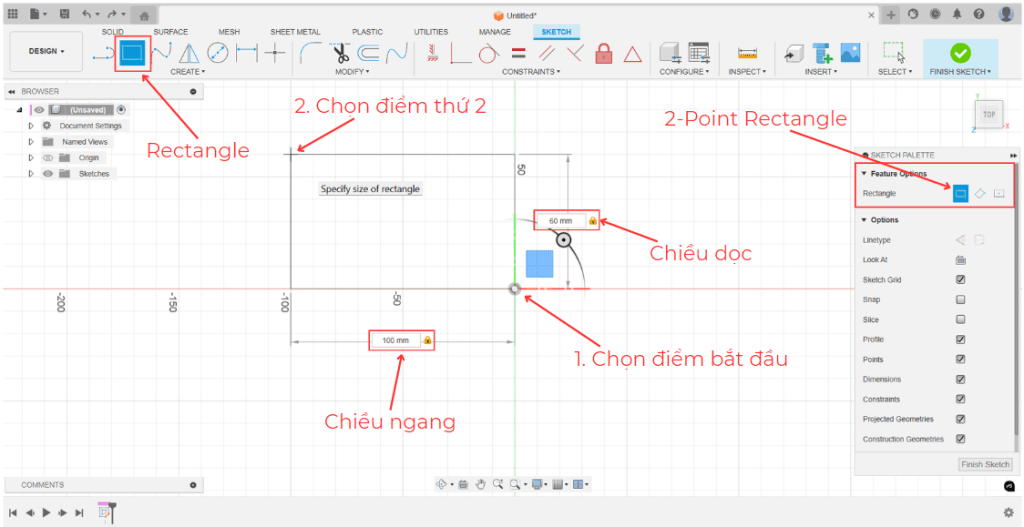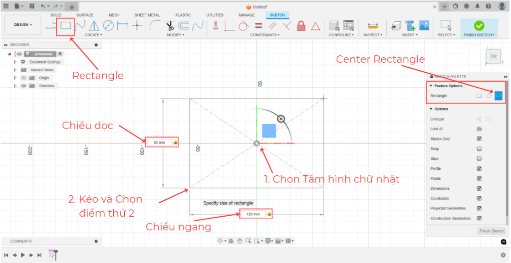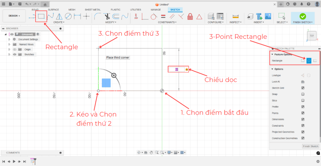 Lệnh Rectangle là lệnh vẽ hình chữ nhật. Bạn có thể tìm thấy lệnh trên thanh công cụ hoặc nhấn phím tắt “R” từ bàn phím. Trong Fusion, nhà phát triển đã tạo ra 3 cách để vẽ hình chữ nhật, tùy thuộc vào từng trường hợp chúng ta sẽ sử dụng một cách hợp lý.