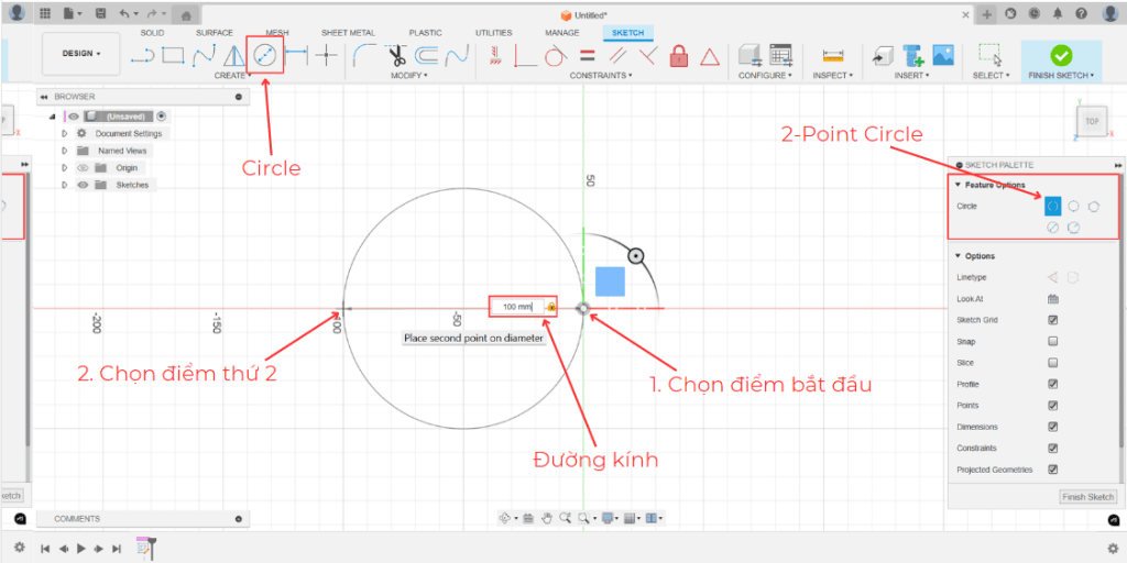 Hình 8: Lệnh vẽ hình tròn qua 2 điểm