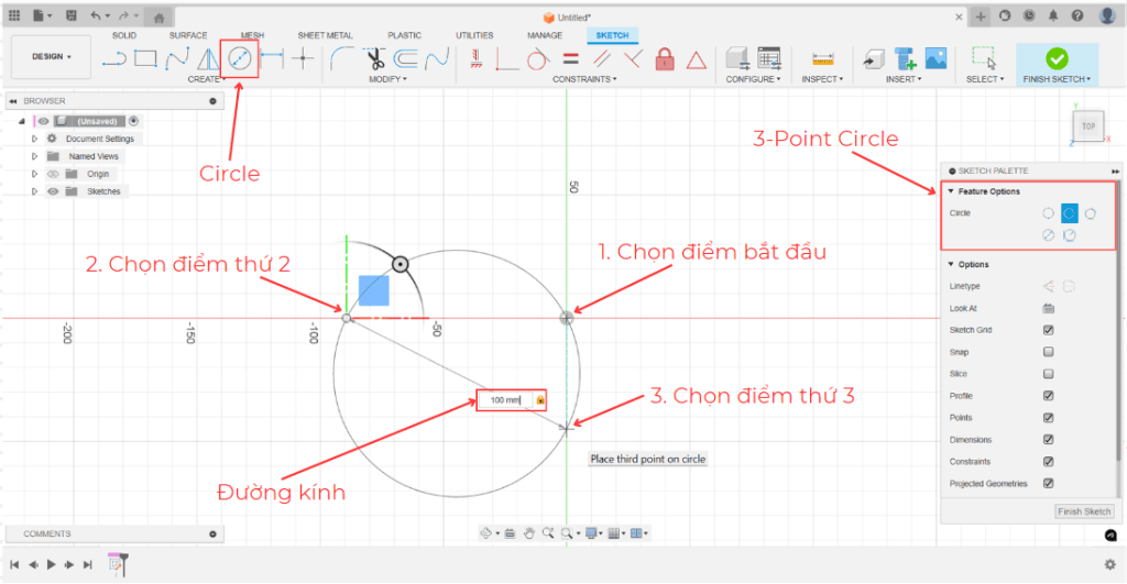 Hình 9: Lệnh vẽ hình tròn qua 3 điểm