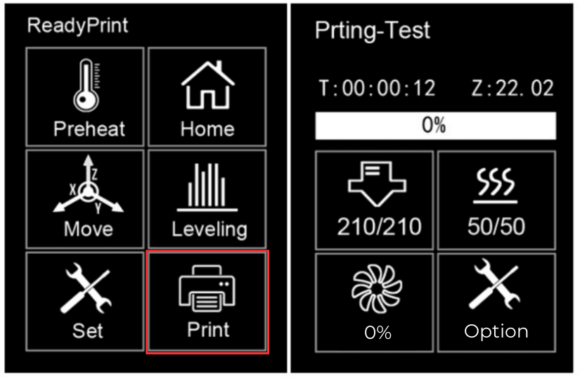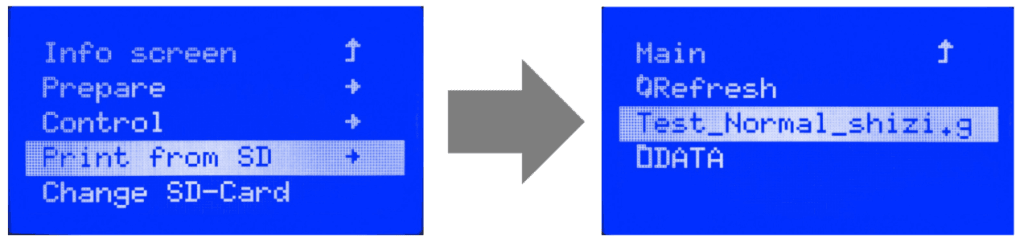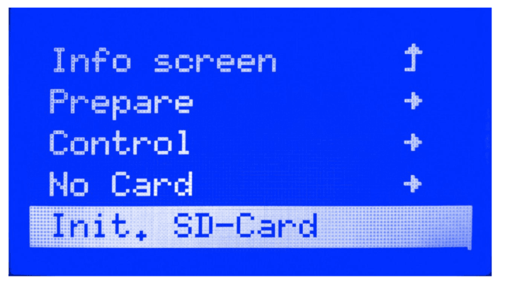 Chú ý: nếu bạn mở Menu và không tìm thấy dòng “Print from SD” (như hình bên), hãy kiểm tra xem bạn đã lắp thẻ nhớ đúng hay chưa và chọn vào dòng “Init SD-Card”. Nếu không được, hãy lắp lại thẻ nhớ và khở động lại máy.