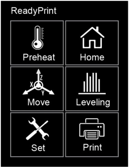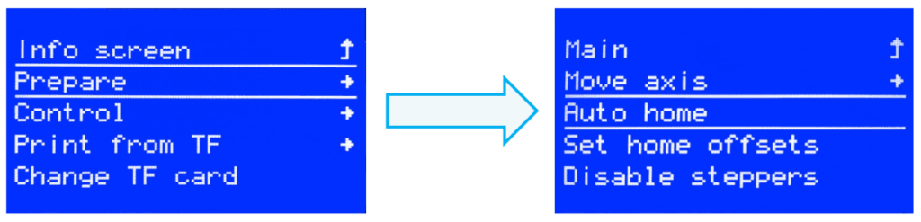 - Bước 1: Di chuyển đầu phun về gốc tọa độ. Menu à Prepare à Auto home. Sau đó chờ cho máy in di chuyển về gốc tọa độ (chạm đủ 3 công tắc hành trình) rồi chuyển sang bước tiếp theo.