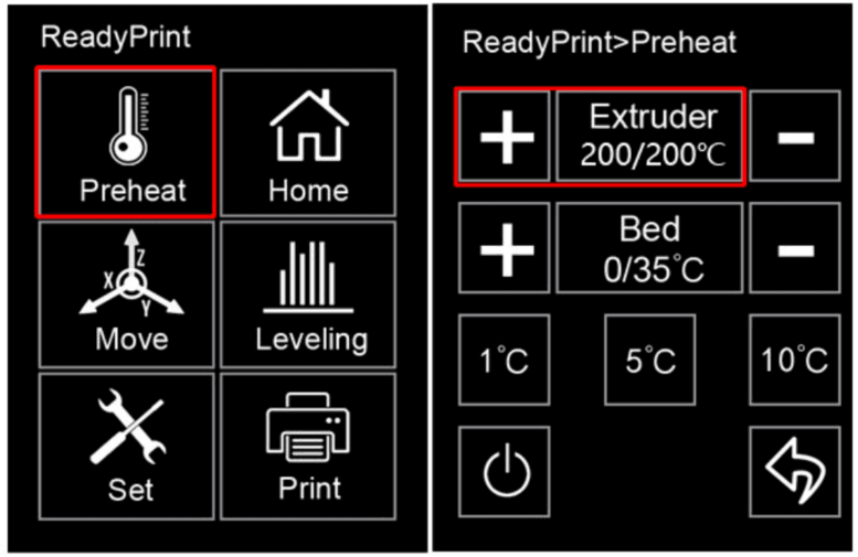 - Bước 2: Tăng nhiệt độ đầu phun và bàn in Preheat à “+”. Ở đây, hãy tăng nhiệt độ của bàn in lên khoảng Extruder = 200 và Bed = 60 . Sau khi nhiệt độ tăng lên đủ, hãy bấm quay lại Menu. Và chuyển sang bước tiếp theo.