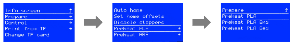 - Bước 3: Gia nhiệt cho bàn in và đầu phun. Menu à Prepare à Preheat PLA à Preheat PLA.