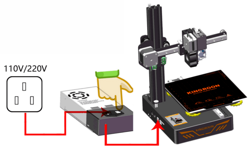 - Bước 2: Bật công tắc nguồn máy in 3D Ender3-v2. Vị trí công tắc ở trên cục nguồn, bên phải của máy.