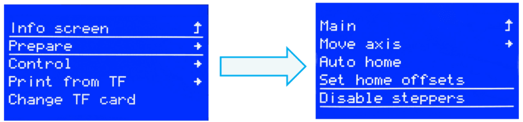 - Bước 2: Tắt trạng thái của động cơ. Menu à Prepare à Disable steppers.