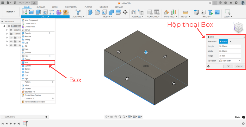 - Chọn lệnh: Tùy thuộc vào thiết kế, ta sẽ linh hoạt chọn đúng lệnh Box, Cylinder, Sphere hoặc Torus để phù hợp với thiết kế.