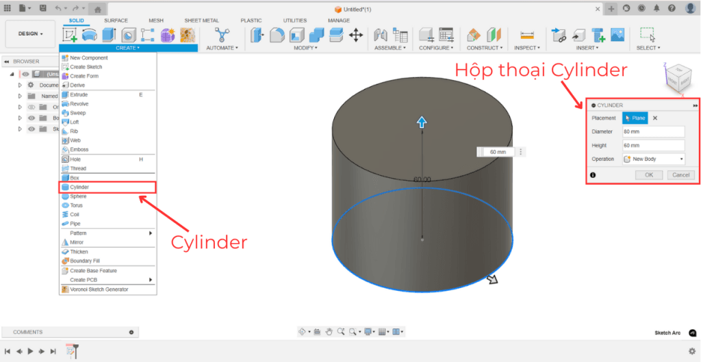 - Nhập thông số kích thước Diameter – đường kính theo thiết kế. Lựa chọn Operation: Join, Cut, Intersect, New Body, New Component cho phù hợp.