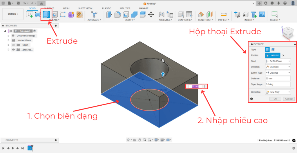 Lệnh Extrude là một trong những công cụ cơ bản và quan trọng nhất, giúp chuyển đổi các phác thảo 2D (Sketch) thành mô hình 3D. Đây là lệnh thường được sử dụng khi bạn muốn tạo khối từ một biên dạng hoặc thêm, loại bỏ vật liệu từ một mô hình hiện có.