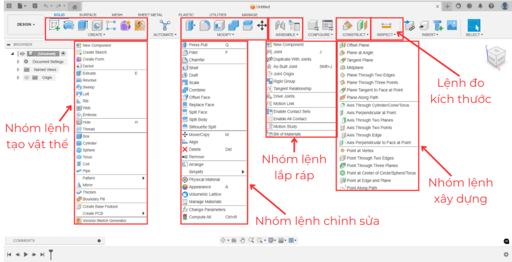 Hình 1: Vị trí các nhóm lệnh trong Fusion 360