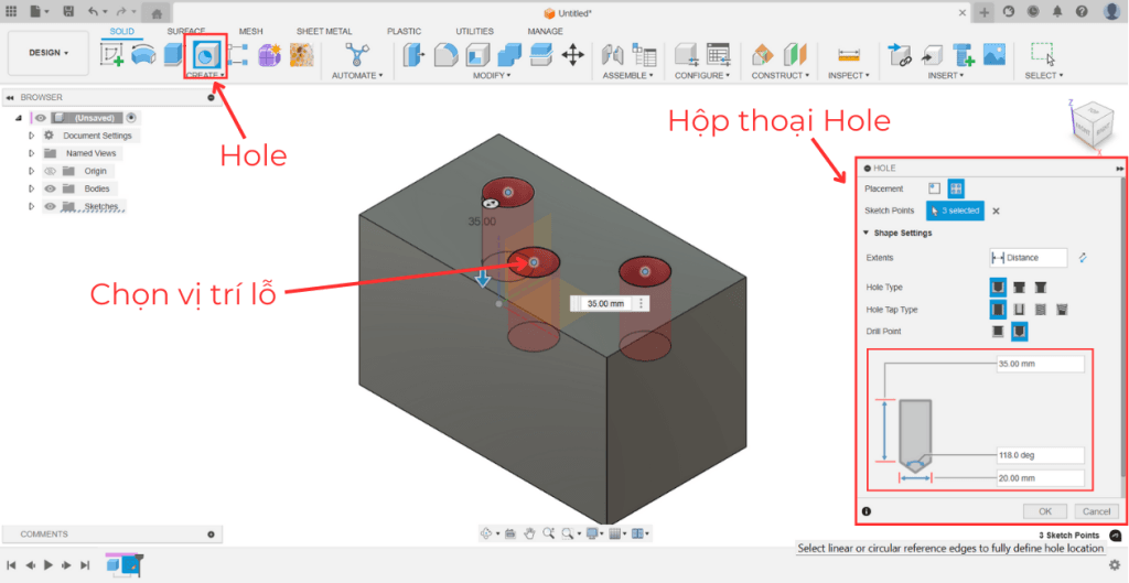 - Xác nhận và hoàn tất: Nhấn OK trong hộp thoại Hole hoặc Enter từ bàn phím để hoàn tất việc tạo lỗ.