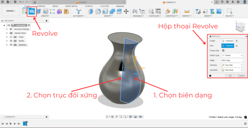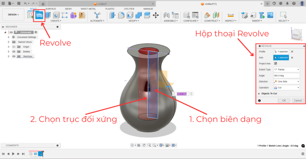 - Xác nhận và hoàn tất: Nhấn OK trong hộp thoại Revolve hoặc Enter từ bàn phím để hoàn tất.