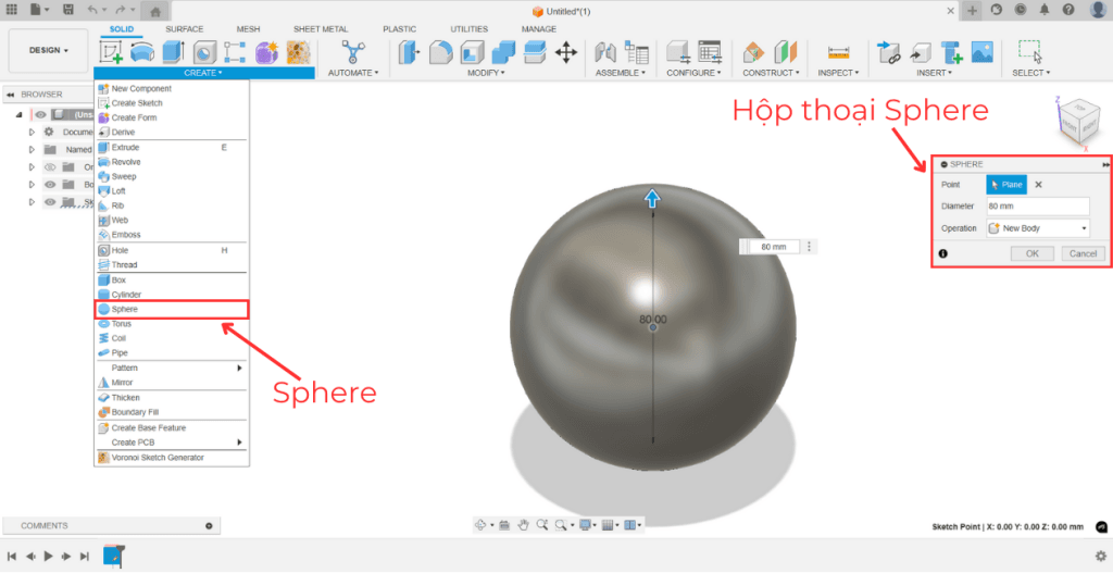 - Tạo điểm định vị (Sketch Point): để dễ dạng trong việc định vị vị trí lỗ, bạn nên vẽ một điểm phác thảo trên bề mặt hoặc cũng có thể chọn một vị trí có sẵn trên mô hình.