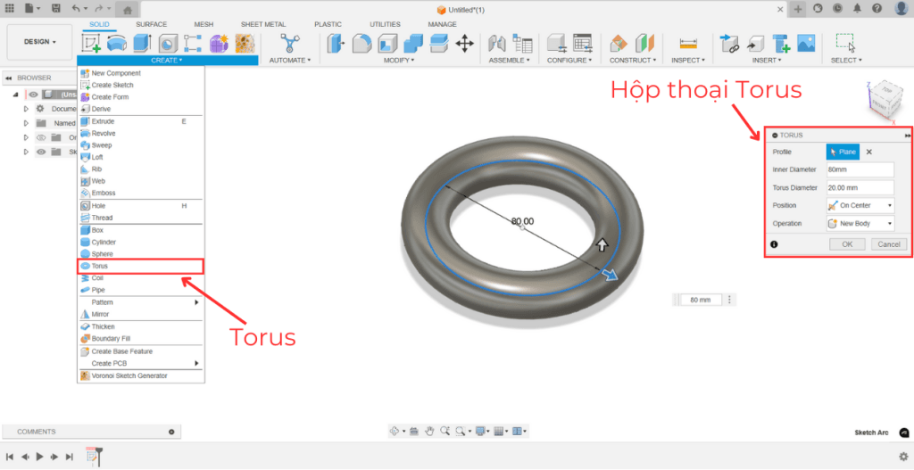 - Nhập các thông số kích thước Inner Diameter – đường kính vòng tròn, Torus Diameter – đường kính biên dạng mặt cắt theo thiết kế.